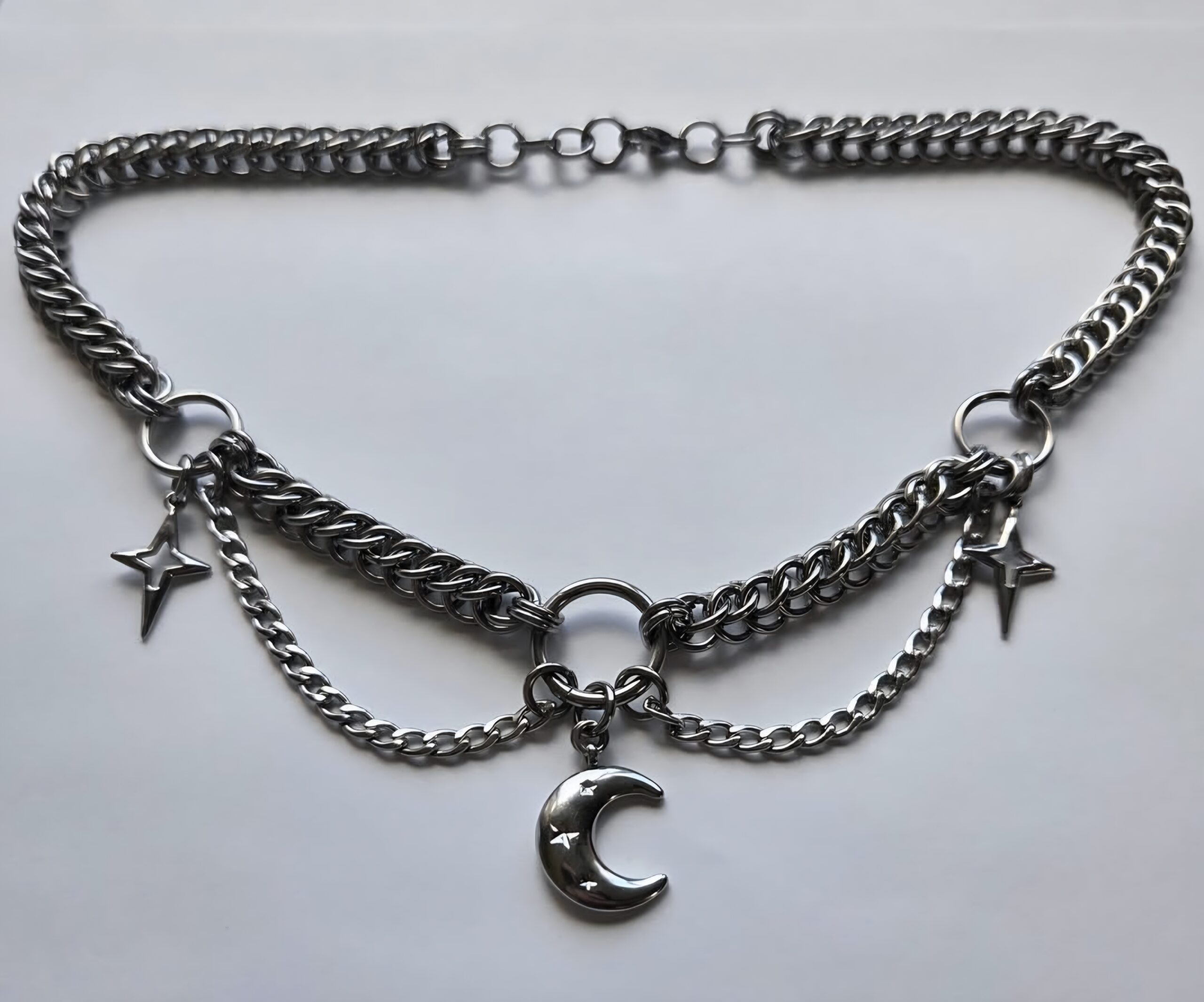 Every dreamer follows the pull of the moon. For those drawn to celestial jewelry, crescent moon necklaces, stainless steel statement pieces, layered chain designs, and alternative luxury, this handmade necklace is for you.